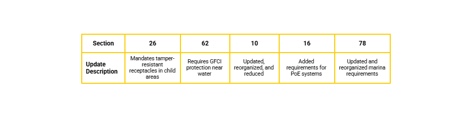 Requirements for power over ethernet systems have been added to Section 16, and requirements for marinas, wharves, and similar facilities have been substantially updated and reorganized in Section 78.