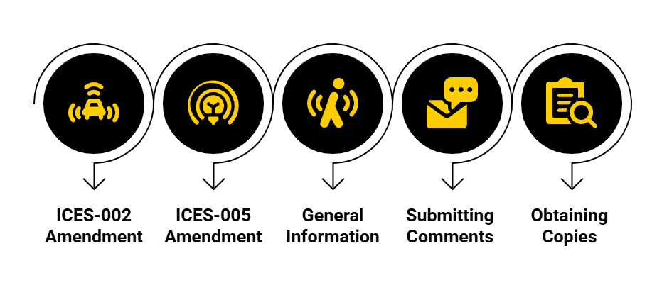Notice is hereby given that Industry Canada is amending the following Interference-Causing Equipment Standards (ICES): ICES-002, which sets out standards for radio noise emissions from spark-ignition systems of vehicles and other devices equipped with internal combustion engines, and ICES-005, which sets out standards for radio noise emissions from Radio Frequency Lighting Devices (RFLDs).