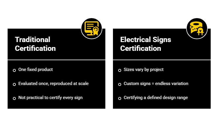 Electrical signs don’t fit the traditional model of certification because they are not built as identical products.