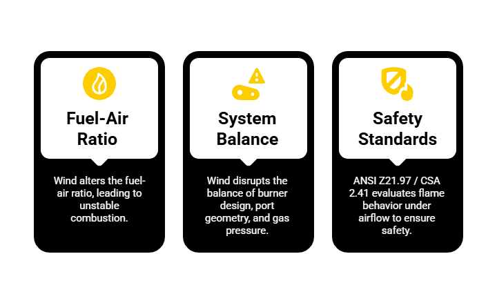 Under ANSI Z21.97 / CSA 2.41, appliances are evaluated to ensure that flame behavior under airflow does not lead to unsafe operation, unintended extinguishing, or delayed ignition scenarios. These are not theoretical concerns, they are real failure modes observed when outdoor appliances meet uncontrolled airflow.